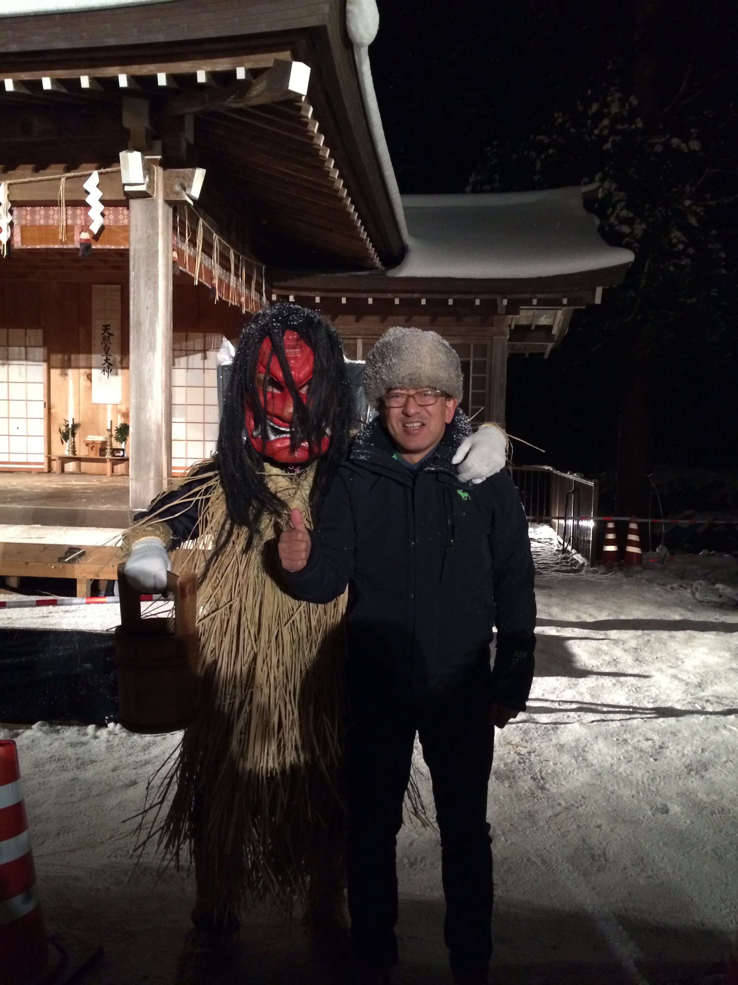 19時からの神事ではじまり、神楽舞台での郷土風習の再現劇やら、太鼓演奏等が繰り広げられ、クライマックスは、山から下りてきたなまはげが、境内に焚かれた紫灯(せど)の周りをたいまつを片手に練り歩くのを、間近で見学。歩いた後に落ちているなまはげのきていた蓑の藁を拾うとご利益があるとのこと。