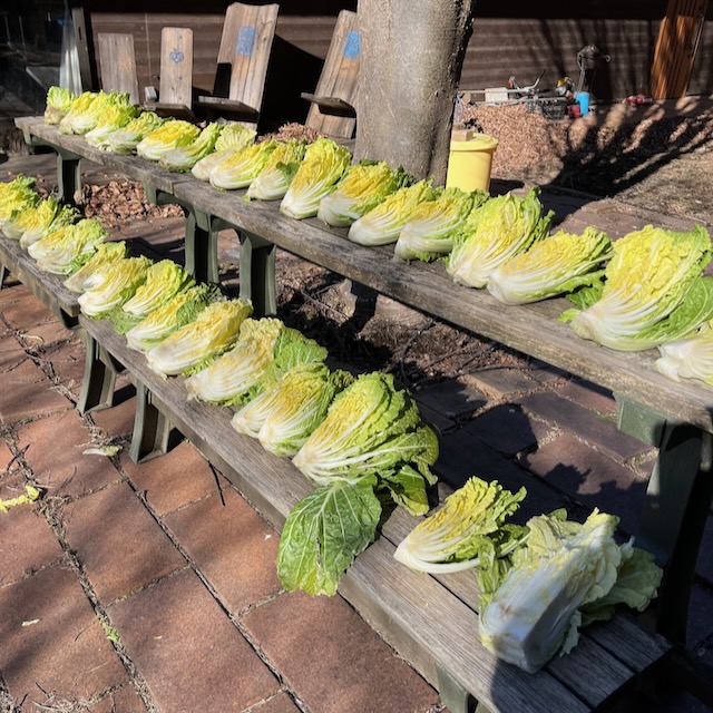 今年は、そんなに定植が遅くなかったけど、肥料とかあげてなかったからなのか、結球が進まなくて、やっと今日白菜を収穫。とりあえず、しっかり結球している10玉を選んで、天日干ししたあと漬け込み。
